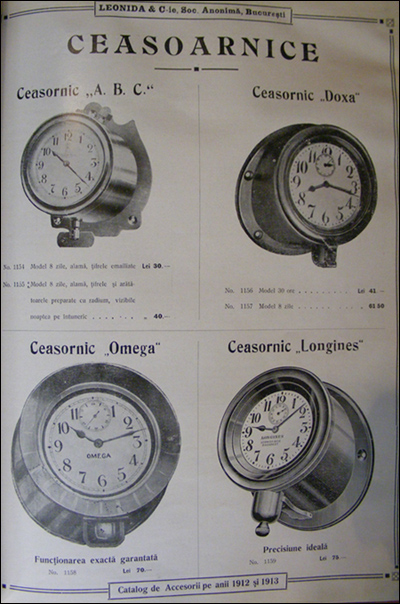 In “Automobile | Catalog de Accesorii 1912-1913” (scan dreapta) sunt prezentate si ceasurile de bord cu care puteau fi echipate automobilele distribuite de Leonida & Cie.