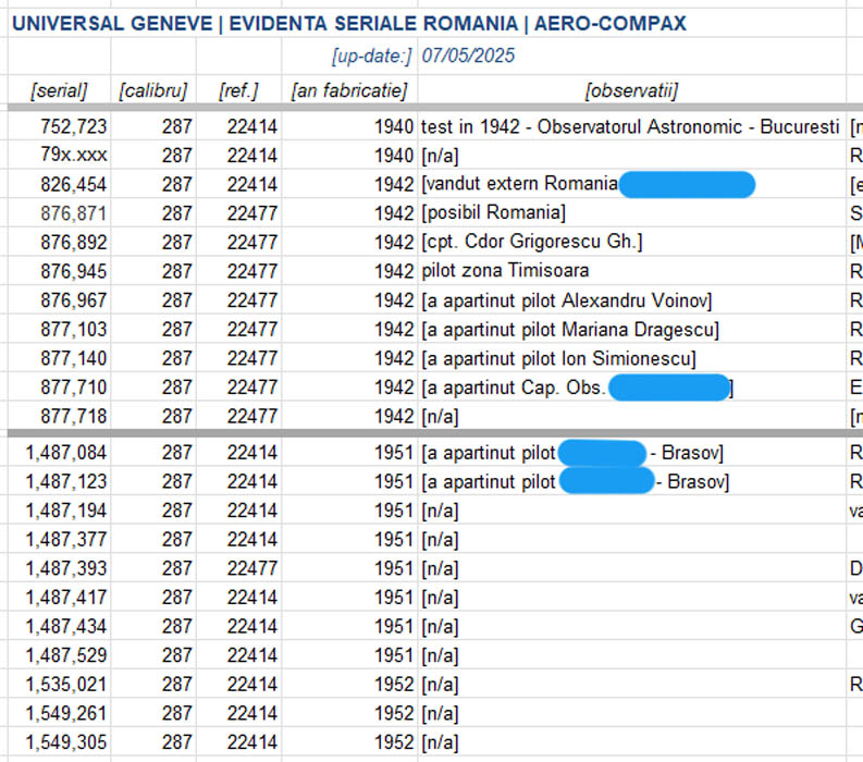 Lista ceasurilor Universal Geneve - AeroCompax (in legatura cu piloti romani) identificate in diverse colectii [mai.2025]: